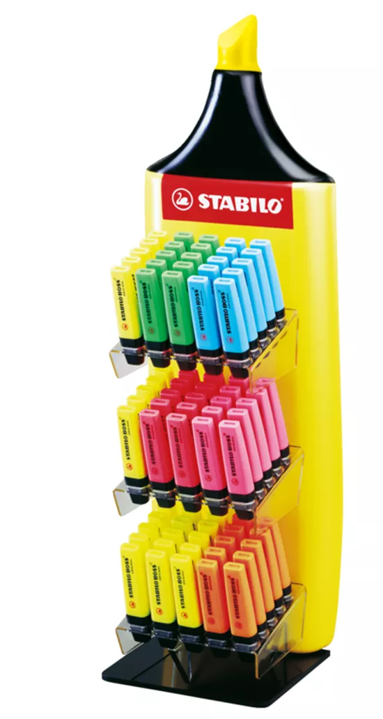 BOSS Display gefüllt mit 75 Stück STABILO BOSS Einzelstifte, in Form eines gelben STABILO BOSS.