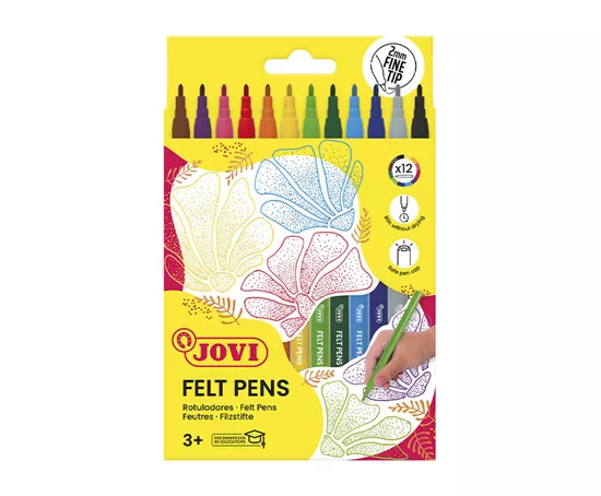 Den JOVI Filzstiften kann man einfach nicht widerstehen. Dieses 12er Set mit feiner 2-mm-Spitze überzeugt durch eine grosse Farbvielfalt und eine stark haftende Tinte, die für intensive, leuchtende Farbergebnisse sorgt. Ideal für Zeichnungen, Ausmalbilder, Skizzen, Schreiben und kreative Bastelarbeiten.