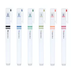Im Gegensatz zu doppelseitigen Stiften, bei denen man zum Gebrauch die Seiten wechseln und die Kappe wieder aufsetzen muss, befinden sich bei Ninipie der Fineliner und die Rundspitze nebeneinander an einem Ende.