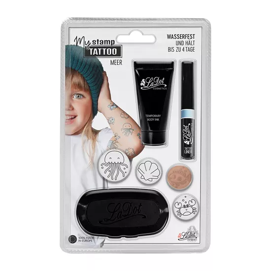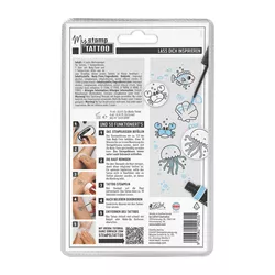 Neben 4 themenbezogenen Stempeldesigns enthält jedes Set eine Tube mit schwarzer Body-Tinte, ein Stempelkissen und einen farblich passenden Liner. Also alles Nötige für den Start in die temporäre Tattoowelt.