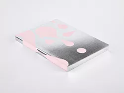 - Fleur de cerisier rose sur toile argentée brillante, et voilà : L'effet de profondeur chatoyant rencontre la structure géométrique - plus de finesse n'est pas possible. En haut : bordures de livre brillantes en argent métallisé. S'il existe une avant-garde des carnets de notes, la voici!
