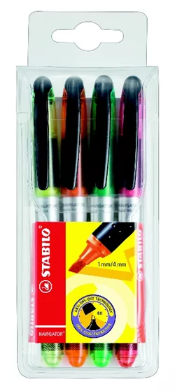 - Description du contenu et de l'emballage: étui de 4 surligneurs avec languette de fixation.