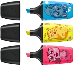 - La collection STABILO Animal Vibes comprend des mini-versions colorées et ludiques des produits STABILO les plus populaires, en édition limitée. Le surligneur STABILO BOSS MINI de cette série est disponible en cinq couleurs fluo avec d'adorables motifs d'animaux. Ce lot de 3 comprend les couleurs rose – suricate (56), bleu – chauve-souris (31) et jaune – hamster (24).