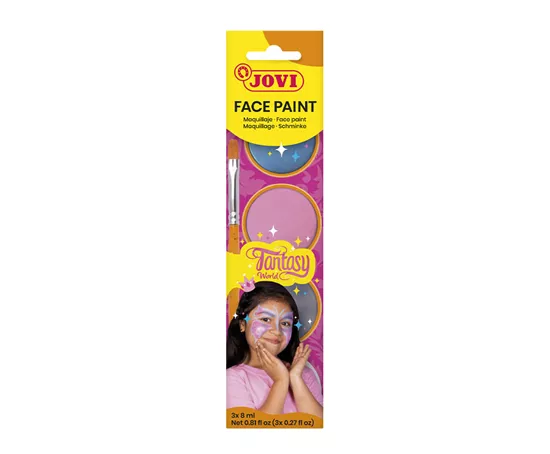 Le set FACE PAINT FANTASY est un maquillage pour le visage créatif, idéal pour réaliser des looks féeriques, des personnages de conte et des transformations colorées. Les trois crèmes de maquillage en rose, bleu et violet conviennent parfaitement aux fées, licornes, princesses, créatures magiques et autres motifs fantasy. Le set comprend une éponge de maquillage et un pinceau plat pour une application précise des détails et des surfaces. La crème Face Paint JOVI possède une texture à base d’huile et s’applique facilement sur la peau sans eau. Le format pratique en petits pots permet de prélever la couleur proprement avec l’éponge et d’assurer une application maîtrisée. La formule sèche rapidement, ne dessèche pas la peau et ne laisse pas de sensation grasse. Le maquillage s’enlève très facilement à l’aide d’une lingette humide, sans eau ni savon. Il est sans parabènes et sans les principaux allergènes, ce qui le rend adapté aux enfants comme aux adultes. Idéal pour les fêtes d’enfants, les fêtes costumées, le carnaval, le Mardi gras ou Halloween.
