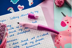 - Le roller ergonomique STABILO EASYoriginal 3D DreamWorld pour gauchers, couleur rose, en édition spéciale avec un design 3D tactile représentant des fées, des licornes et des fleurs.